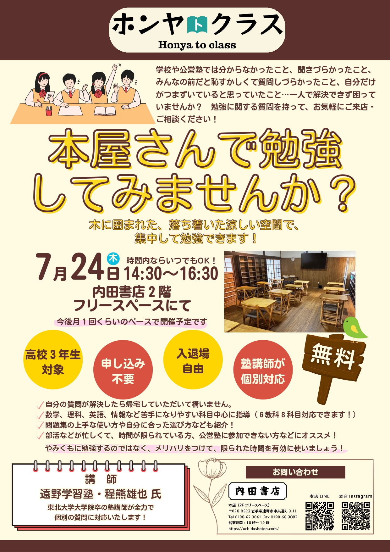 明日 7月24日(木)14:30~16:30、遠野の 内田書店2階フリースペース にて、塾講師による個別質問対応イベント「ホンヤトクラス」を開催します!